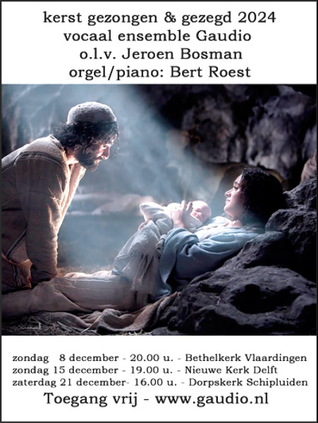 Op zondag 8 december om 20.00 uur brengt vocaal ensemble Gaudio o.l.v. haar nieuwe dirigent, Jeroen Bosman, voor de tweede keer in de Bethelkerk haar programma ‘Kerst gezongen & gezegd’. Organist is Bert Roest. Het is een programma gemodelleerd naar de Engelse Ceremony of Lessons and Carols, zoals die jaarlijks in King’s College Cambridge in de adventstijd wordt uitgevoerd. Een programma met koorzang, samenzang, orgelspel, schriftlezingen en gedichten. Naast traditionele carols wordt ook meer klassieke advents- en kerstmuziek gezongen, zoals dit jaar de ‘Hymn to the Virgin’ van Benjamin Britten en ‘Christus hodie natus est’ van Jan Pieterszoon Sweelinck. Na afloop van de viering is er traditiegetrouw glühwein en/of koffie thee. De toegang is vrij. Wel kunt u na afloop een vrije gift geven. U wordt van harte uitgenodigd om deze sfeervolle ‘opmaat’ naar kerst mee te maken. Rob van Herwaarden ![]() | ||