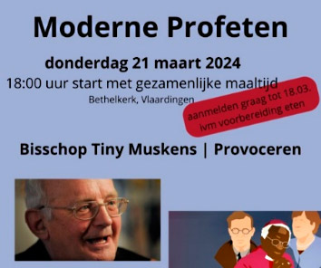 Bisschop Tiny Muskens | Provoceren Donderdag 21 maart 18.00 uur begint met een gezamenlijke maaltijd.Graag aanmelden tot 18 maart i.v.m. de voorbereiding van het eten. Is het profetische bijzonder? Gaat het altijd om bijzondere figuren in de profetische traditie, getalenteerde en gedurfde mensen? Deze aflevering laat zien dat het profetische ook heel gewoon kan zijn. Tiny Muskens was een heel gewoon iemand. Een boerenzoon uit het kleine Brabantse dorp Elshout. Zijn gewoonheid is zijn kracht. Met die gewoonheid durfde hij de opgeblazenheid van mensen door te prikken en te provoceren. Hij was ook bijzonder: hij werd bisschop van Breda. En juist als bisschop durfde hij gewoon te blijven én te provoceren. Pastor Annabell de Jong | ||